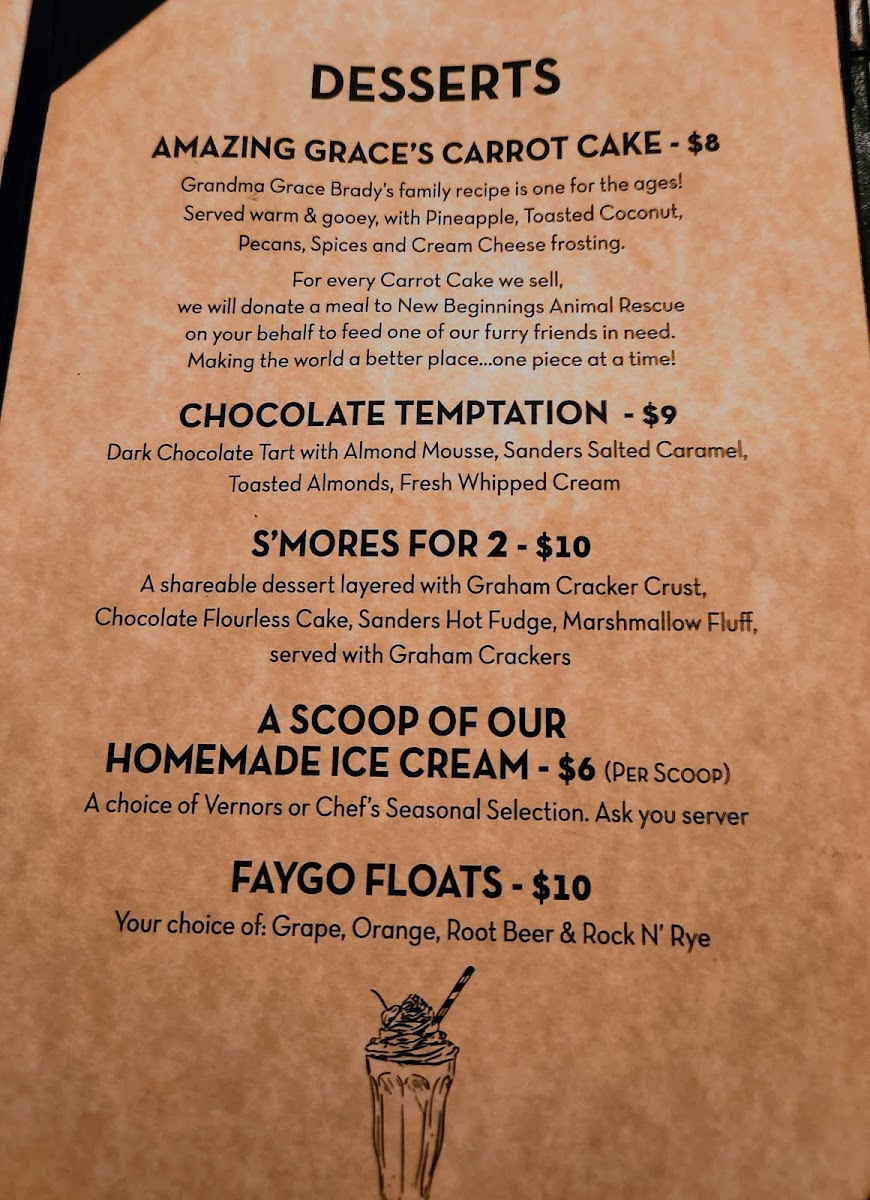 We go for their wonderful happy hour (3-6) whenever we can!! They have delicious appetizers 12 price and great deals on drinks including a large menu of signature cocktails. The dinner menu has a good and interesting variety. The portions and quality were excellent. The various waitstaff are always top notch and a cut above those in most other local restaurants. The atmosphere is relaxed, classic, old world somewhat like a chophouse with hip modern flair somehow- very pleasant. I love it and will be back soon.